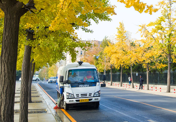 機(jī)洗(洗掃車洗掃吸一體)→機(jī)保(保潔車巡回保潔)→人沖(手持槍沖洗人行道)→人工(人工清掃保潔)